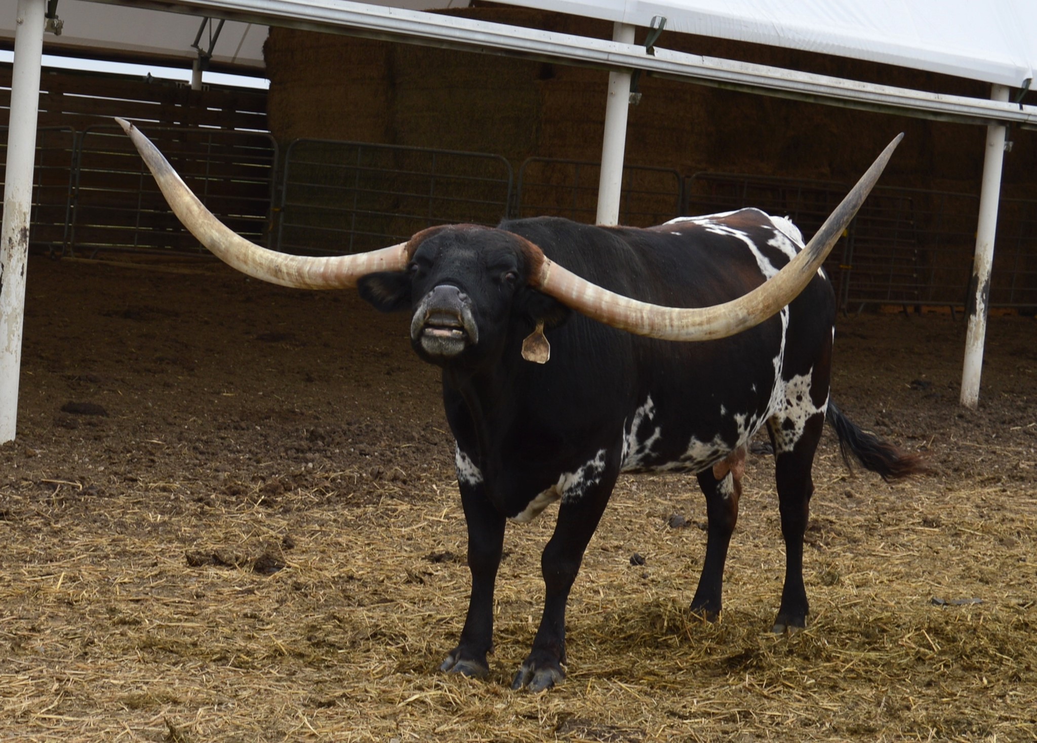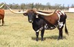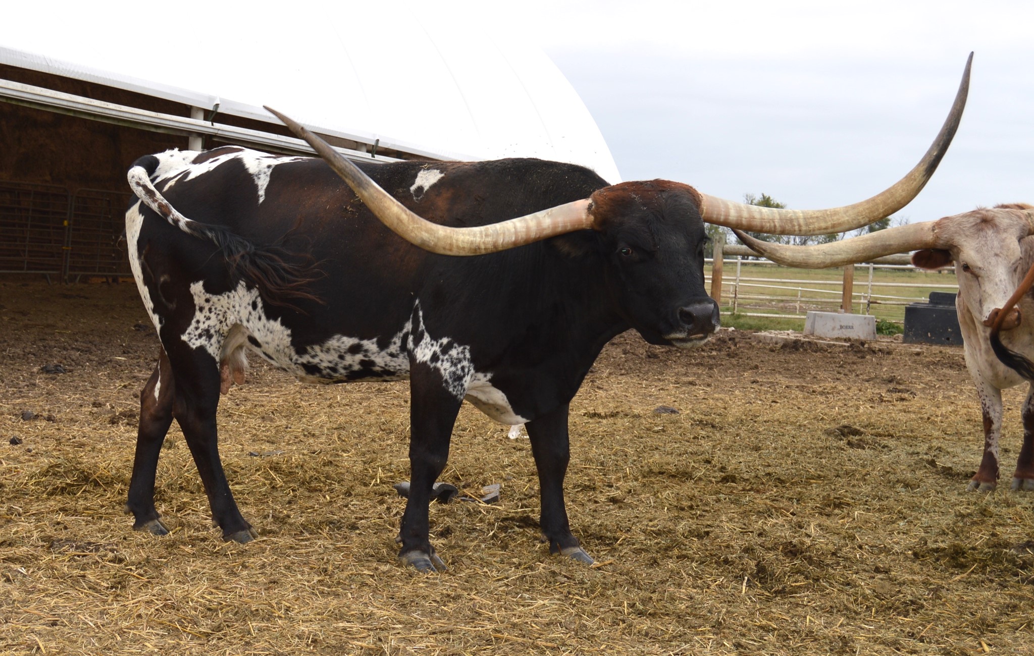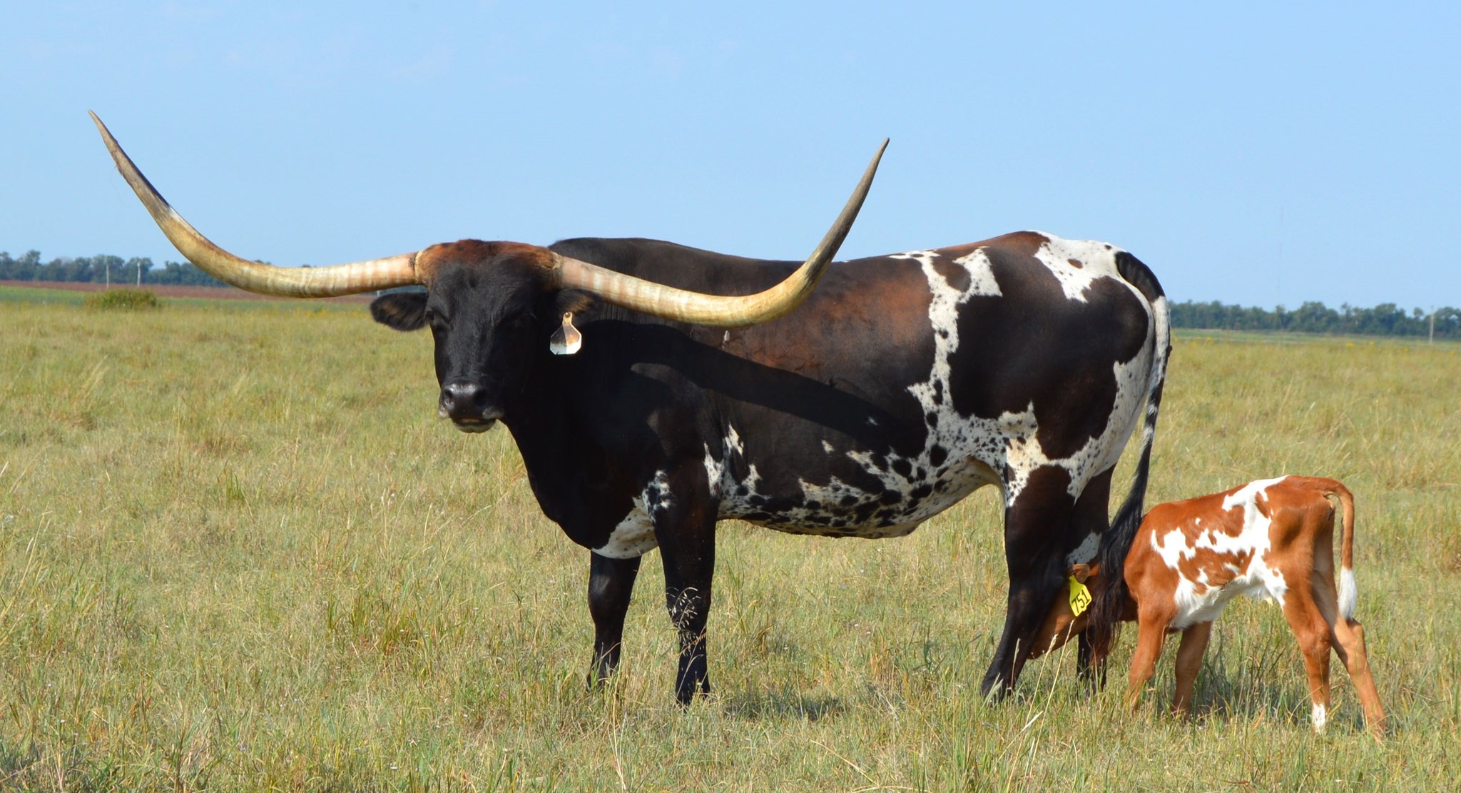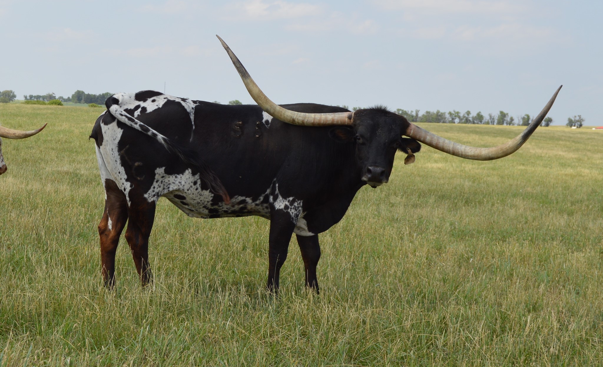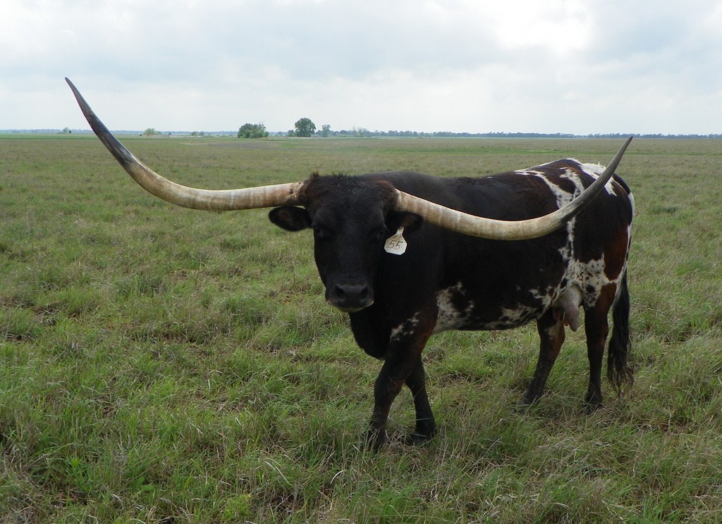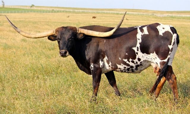 55 KC HERSHEYS KISS is an exciting addition to our herd! HERSHEY is a big-bodied dark parker brown and white cow with big swooping horns, that are over 90 inches TTT. Unfortunately KC HERSHEYS KISS passed away during the drought of 2022. We have a daughter of hers LMR Baby Ruth & a son LMR Peanut M&M'S! We also have a heifer out of Hershey's son TCC GUNSMOKE! RJF Dream Catcher is in the pasture with our true black Saddlehorn son. So, HERSHEYS amazing genetics live on in our herd at Long M Ranch It is worth a sad heart to let everyone know this beautiful animal died during the drought & heat of August 2022